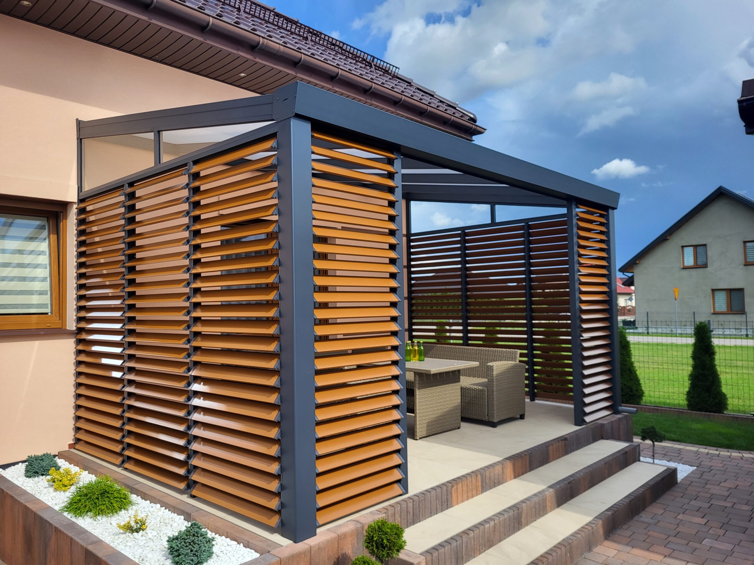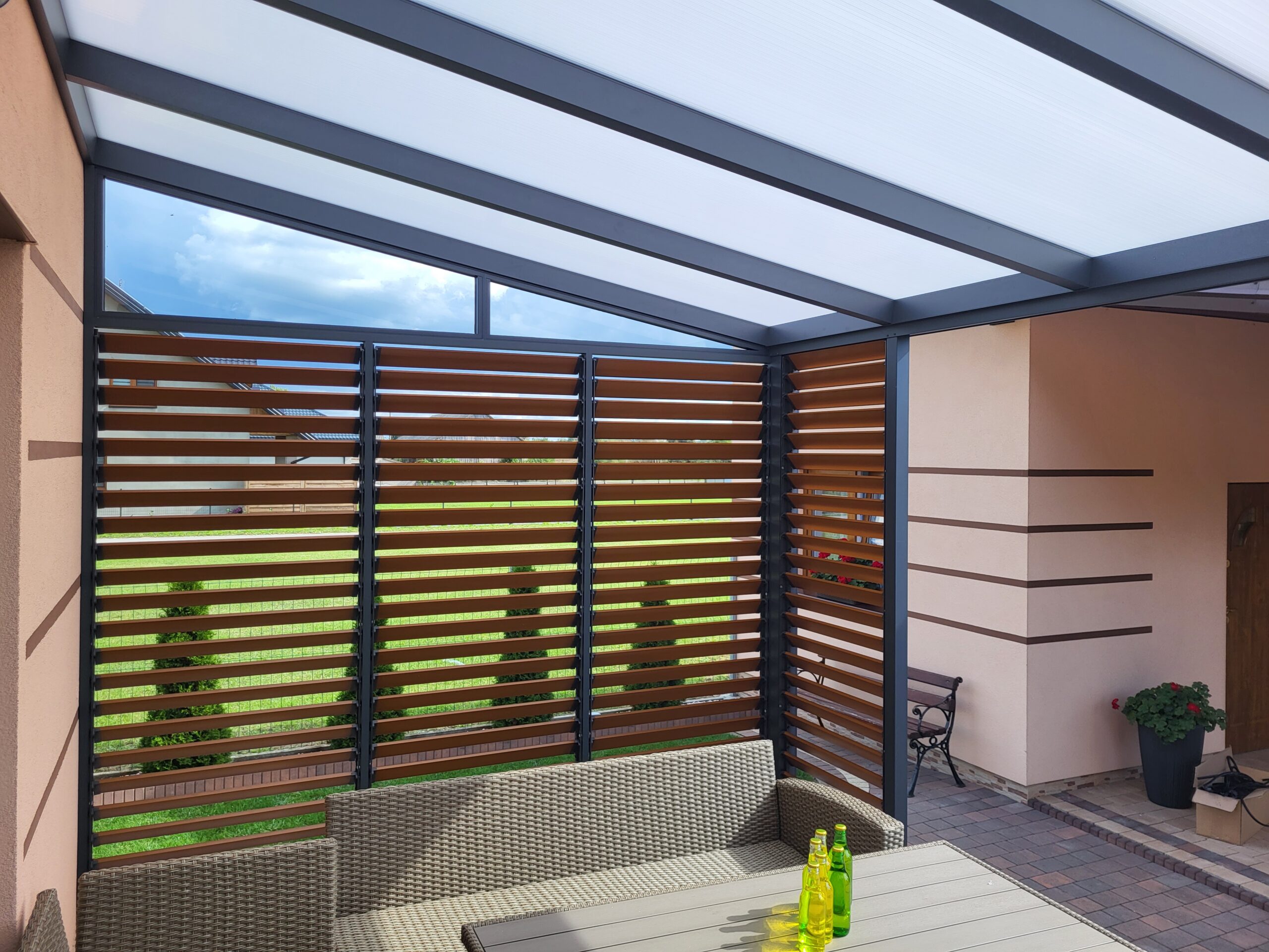 Proponujemy zadaszenia stałe oraz przesuwne, dzięki czemu użytkownik może dostosować stopień osłony do warunków pogodowych i własnych preferencji. Szkło hartowane zapewnia elegancki wygląd i maksymalne doświetlenie tarasu, natomiast poliwęglan mleczny skutecznie chroni przed promieniami UV oraz nadmiernym nagrzewaniem. Dodatkowo, oferujemy rolety screen, boczne osłony oraz oświetlenie LED, które zwiększają funkcjonalność tarasu, pozwalając na komfortowe korzystanie z przestrzeni nawet po zmroku.
